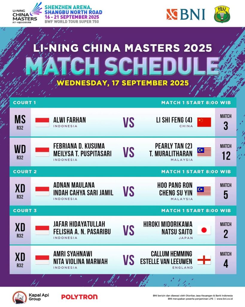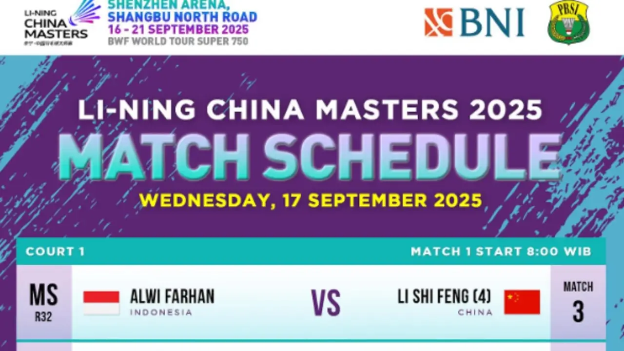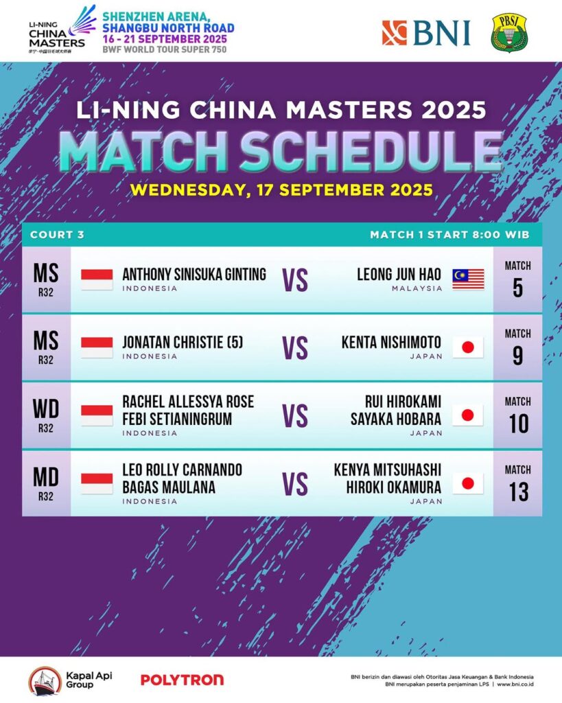 JURNALZONE.ID – Sebanyak sembilan wakil Indonesia akan melanjutkan perjuangan mereka pada hari kedua turnamen bulu tangkis Li-Ning China Masters 2025, yang akan digelar di Shenzhen Arena, Rabu (17/9/2025). Para andalan Merah Putih dari berbagai sektor, termasuk tunggal putra Jonatan Christie dan Anthony Sinisuka Ginting serta ganda putri Febriana D. Kusuma/Meilysa T. Puspitasari, akan menghadapi lawan-lawan tangguh untuk memperebutkan tiket ke babak selanjutnya dalam kejuaraan BWF World Tour Super 750 ini.