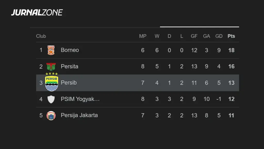 | 2 Persita | 8 | 5 | 1 | 2 | 13 | 9 | 4 | 16 |