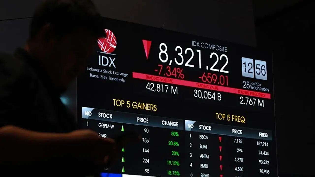 Laju Indeks Harga Saham Gabungan (IHSG) semakin terperosok pada perdagangan sesi kedua, Senin, 2 Februari 2026. Berdasarkan data RTI pukul 14.27 WIB, indeks anjlok 5,54% atau terpangkas 461,78 poin ke level 7.867,83.