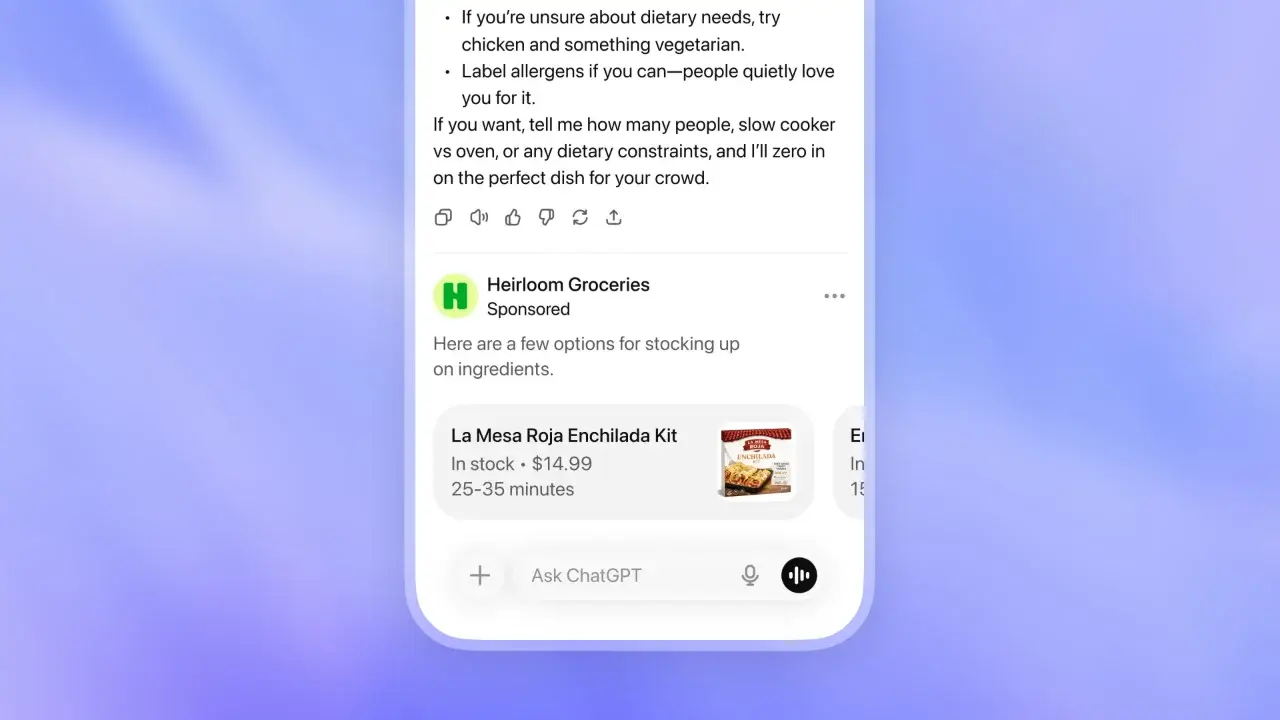 Dalam demonstrasi visual yang dibagikan, terlihat contoh iklan dari “Heirloom Groceries”. Iklan tersebut menampilkan produk “La Mesa Roja Enchilada Kit” dengan harga $14.99 dan estimasi waktu penyajian 25-35 menit, yang muncul tepat di bawah kolom interaksi jawaban.
