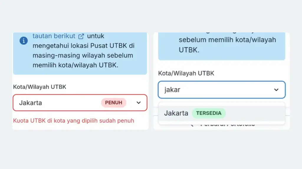 Jika kita melihat keterangan “PENUH” berwarna merah saat memilih Kota atau Wilayah UTBK, hal tersebut bukan berarti peluang kita untuk ikut ujian sudah tertutup, karena panitia SNPMB melakukan pembaruan atau update kuota lokasi ujian secara berkala setiap harinya. Apabila hari ini kursi di wilayah pilihan kita habis, kemungkinan besar kursi tambahan atau slot baru akan tersedia kembali keesokan harinya seiring dengan sinkronisasi sistem dan pengaturan teknis di titik lokasi ujian.