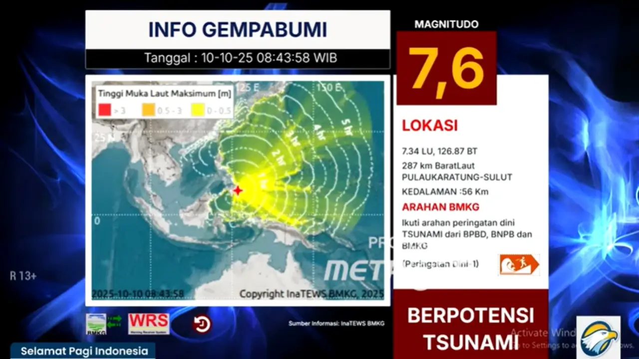 Gempa bumi berkekuatan besar dengan magnitudo (M) 7,6 mengguncang wilayah Sulawesi Utara (Sulut) pada hari ini, Jumat, 10 Oktober 2025, sekitar pukul 08.43 WIB.